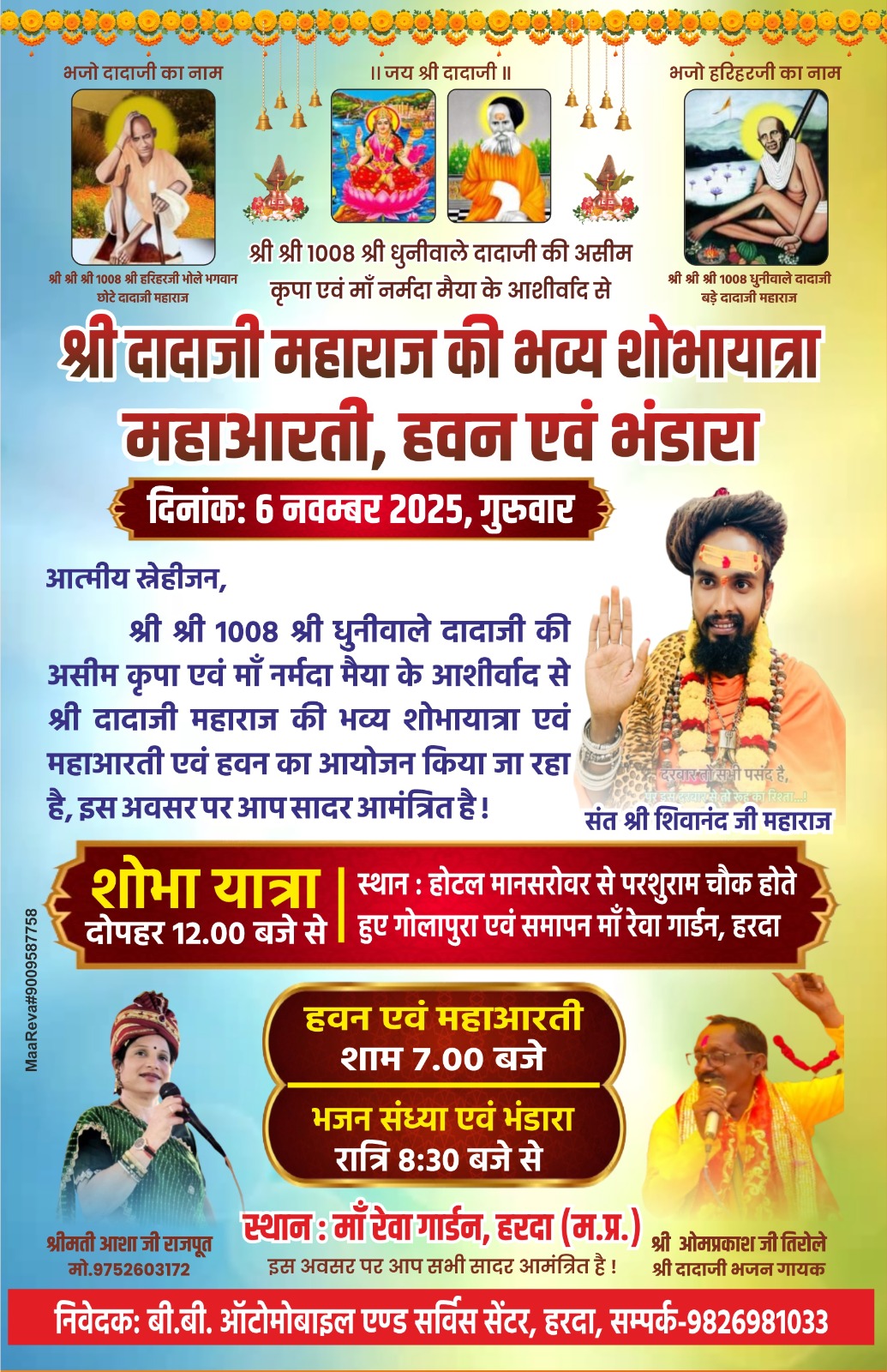 Sun, Nov 2, 2025संत शिवानंद दादा जी पहुंचे हरदा जिला हजारों की संख्या में भक्त कर रहे दर्शन।