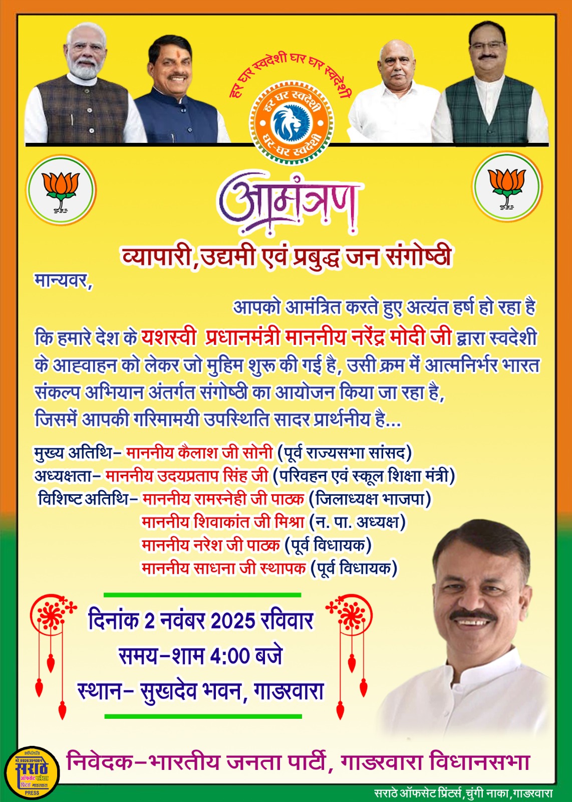 विधायक मंत्री राव उदय प्रताप सिंह गाडरवारा में कार्यक्रम में आयेंगे l : राज्यसभा सदस्य मंत्री पूर्व विधायक गाडरवारा मेआज में आज