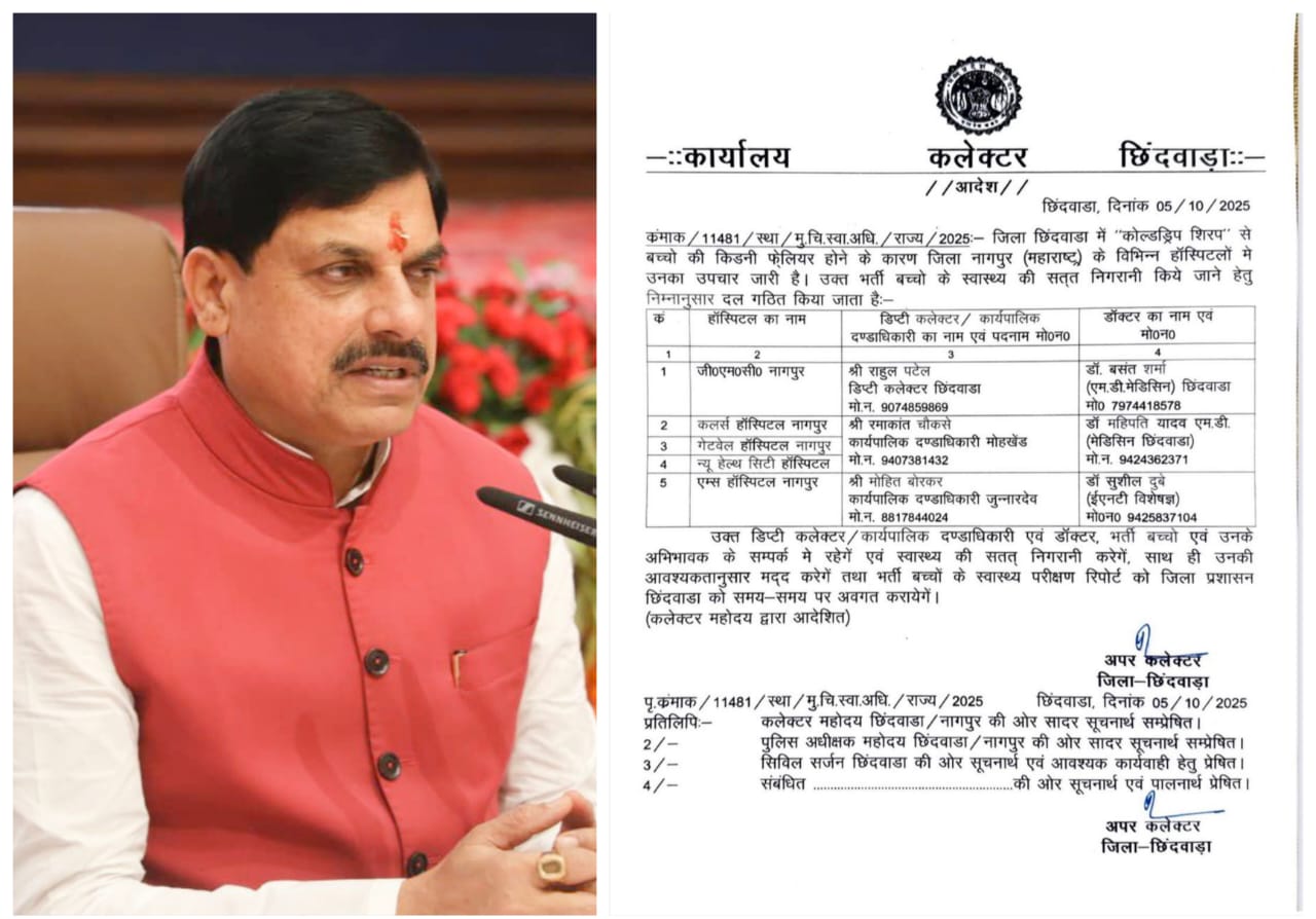 : मुख्यमंत्री डॉ मोहन यादव द्वारा निर्देश दिए,दूषित कोल्डड्रिप सिरप की वजह से किडनी संक्रमण से ग्रस्त छिंदवाड़ा के 07 और बैतूल के 02 कुल 09 बच्चे नागपुर के विभिन्न अस्पतालों में उपचाररत हैं. मुख्यमंत्री डॉ मोहन यादव ने उक्त बच्चों के इलाज का सम्पूर्ण व्यय राज्य शासन द्वारा वहन करने के निर्देश दिये हैं. इलाज की समुचित व्यवस्था सुनिश्चित करने के लिये कार्यपालिक दंडाधिकारी और डाक्टर्स की संयुक्त टीम की तैनाती नागपुर के विभिन्न अस्पतालों में की गई है. उक्त टीम द्वारा प्रभावित परिवारों और अस्पतालों के साथ सतत सम्पर्क में रहकर बच्चों के इलाज के लिये समुचित व्यवस्था की जा रही है.