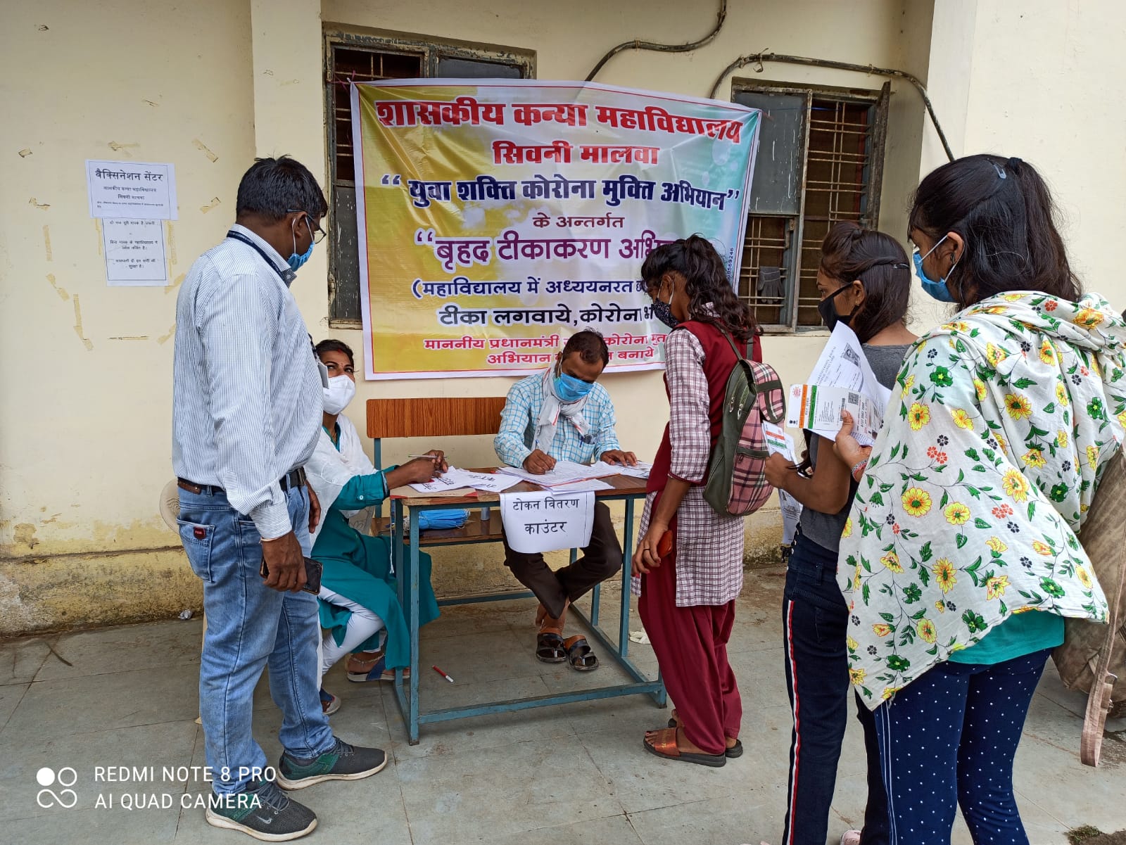 : शासकीय कन्या महाविद्यालय सिवनी मालवा में छात्राओं का हुआ वैक्सीनेशन शासकीय कन्या महाविद्यालय सिवनी मालवा होशंगाबाद में डॉ. कामिनी जैन प्राचार्य, शासकीय अग्रणी गृह विज्ञान स्नातकोत्तर महाविद्यालय होशंगाबाद के निर्देशन में युवा शक्ति कोरोना मुक्ति अभियान के अंतर्गत टीकाकरण शिविर का आयोजन किया गया।जिसमें महाविद्यालय के प्राचार्य डॉ. बाऊ पटेल ने बताया कि हमारा लक्ष्य शत प्रतिशत छात्राओं का वैक्सीनेशन का है, जिसके तहत आज महाविद्यालय में अध्ययनरत कला वाणिज्य तथा विज्ञान संकाय की सभी छात्राओं का वैक्सीनेशन किया गया जिसमें लगभग 70% छात्राओं का वैक्सीनेशन हुआ । तथा शेष छात्राओं के लिए आने वाले दिनों में स्वास्थ्य विभाग के सहयोग से और भी वैक्सीनेशन शिविर लगाए जाने के लिए कहां गया। बीएमओ डॉ. जी. आर. करोड़े, महाविद्यालय टीकाकरण समिति एवं युवा शक्ति कोरोना मुक्ति के विशेष तत्वधान में कार्यक्रम को सफल बनाने हेतु विशेष प्रयास किया गया। टीकाकरण शिविर में एनएसएस अधिकारी कुमारी काजल रतन, क्रीड़ा अधिकारी डॉ धर्मेंद्र गुर्जर, एनएसएस तथा एनसीसी की छात्राओं द्वारा अपना सहयोग प्रदान किया गया। महाविद्यालय में इस अवसर पर प्राचार्य डॉ. बाऊ पटेल चिकित्सा विभाग के अधिकारी कर्मचारी एवं समस्त महाविद्यालय स्टाफ उपस्थित रहा,,